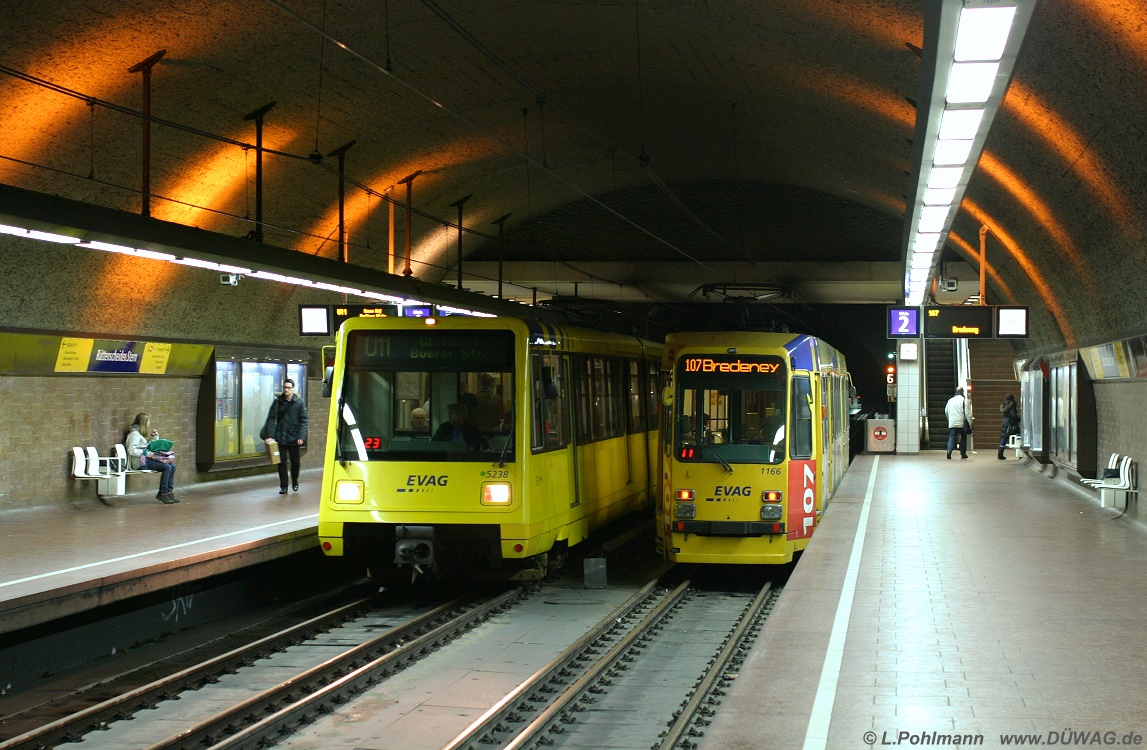 | Tw 5238 (P86, ex Docklands Light Railway, London) und Tw 1166 (DÜWAG M8C) in der Station "Rüttenscheider Stern" (30.01.13) Beachtenswert ist, daß auf dieser Teilstrecke regelspurige und schmalspurige Fahrzeuge verkehren und die gleichen Bahnsteige benutzen. |