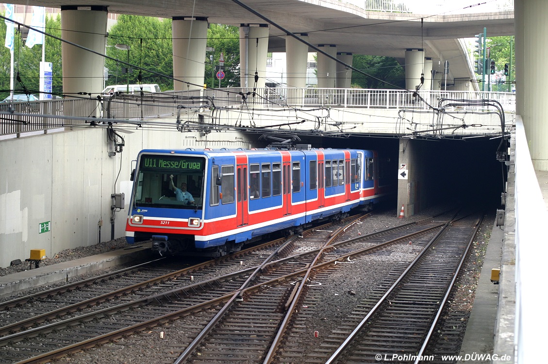| Tw 5238 (P86, ex Docklands Light Railway, London), hier noch mit originaler Farbgebung und originalen Türen, kurz vor der Endhaltestelle "Messe/Gruga" (28.07.06) Dies war damals die einzige Stelle, wo die U11 ans Tageslicht kam und dadurch den Fahrer veranlaßte, das Sonnenrollo herunterzuziehen. |