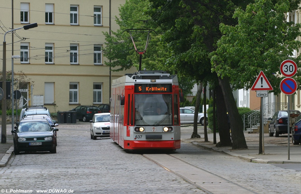 Tw 637 in Merseburg am 18.05.2010. Dieser Wagentyp ist noch eine Konstruktion von DÜWAG.